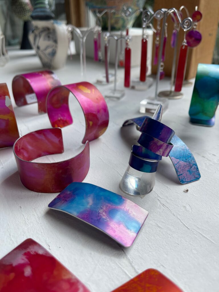 height and structure into gardens, blending vibrant hues to enhance planting .In addiction, my jewellery, crafted from anodised aluminium, silver and semi precious stones , are a unique blend of artistry and wearability.through these varied mediums, I strive to create pieces that resonate deeply, inviting viewers and wearers alike to experience the beauty and emotion of rich colour . As a multimedia artist I am constantly experimenting with different materials and techniques, so there’s always something new to discover and to be inspired by . And every new discovery will hold a thread of what’s gone before so that the each piece will have “ the hand of the artist visible “ .
