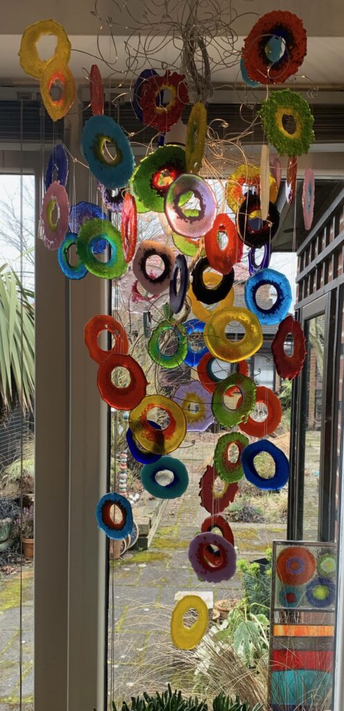 Stained glass columns and fused glass pieces designed for the garden. Anodised Aluminium and fused glass jewellery and mixed media.