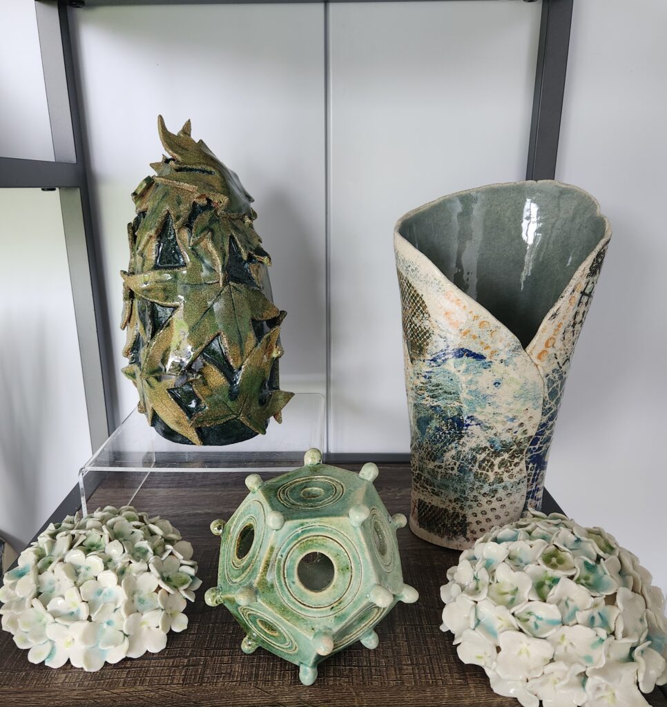 An eclectic mix of clay techniques: Sculpture, Garden Sculpture. Clay Mono-printing, Thrown vessels, Dodecahedron, Hand-building projects. A cornucopia of clay!
