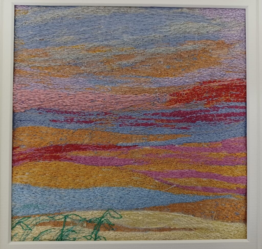 Carol creates her richly textured embroideries by using her sewing machine as a means of drawing and painting, stitching directly onto painter’s canvas.
