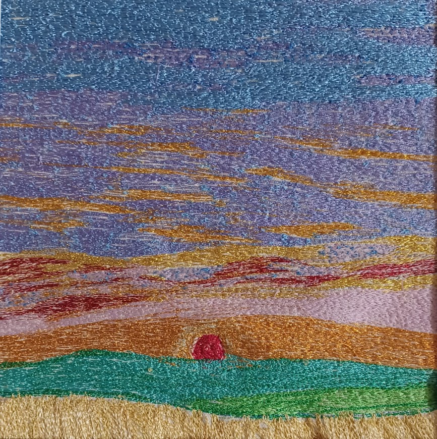 Carol creates her richly textured embroideries by using her sewing machine as a means of drawing and painting, stitching directly onto painter’s canvas.