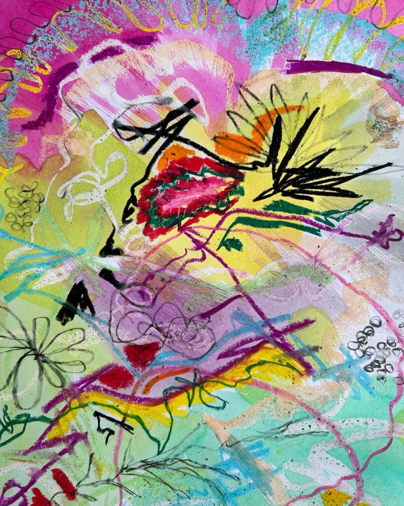 I find it bold to say I’m an artist, it takes courage to own that noun. For me, art making is an ongoing experiment in self-expression. I love to use a whole mix of medium, from collage, to water inks, to acrylics, to words – sometimes trying to capture a moment I’ve seen, other times to express a feeling I have or even to catch a dream before it evaporates. That’s why I also use reflective writing as a response either to the image or ahead of the image, as another route into self-expression. These art forms are part of giving my inner world form. I notice that I can’t do without vivid colours and lean towards whimsical ways of portraying the world around me.