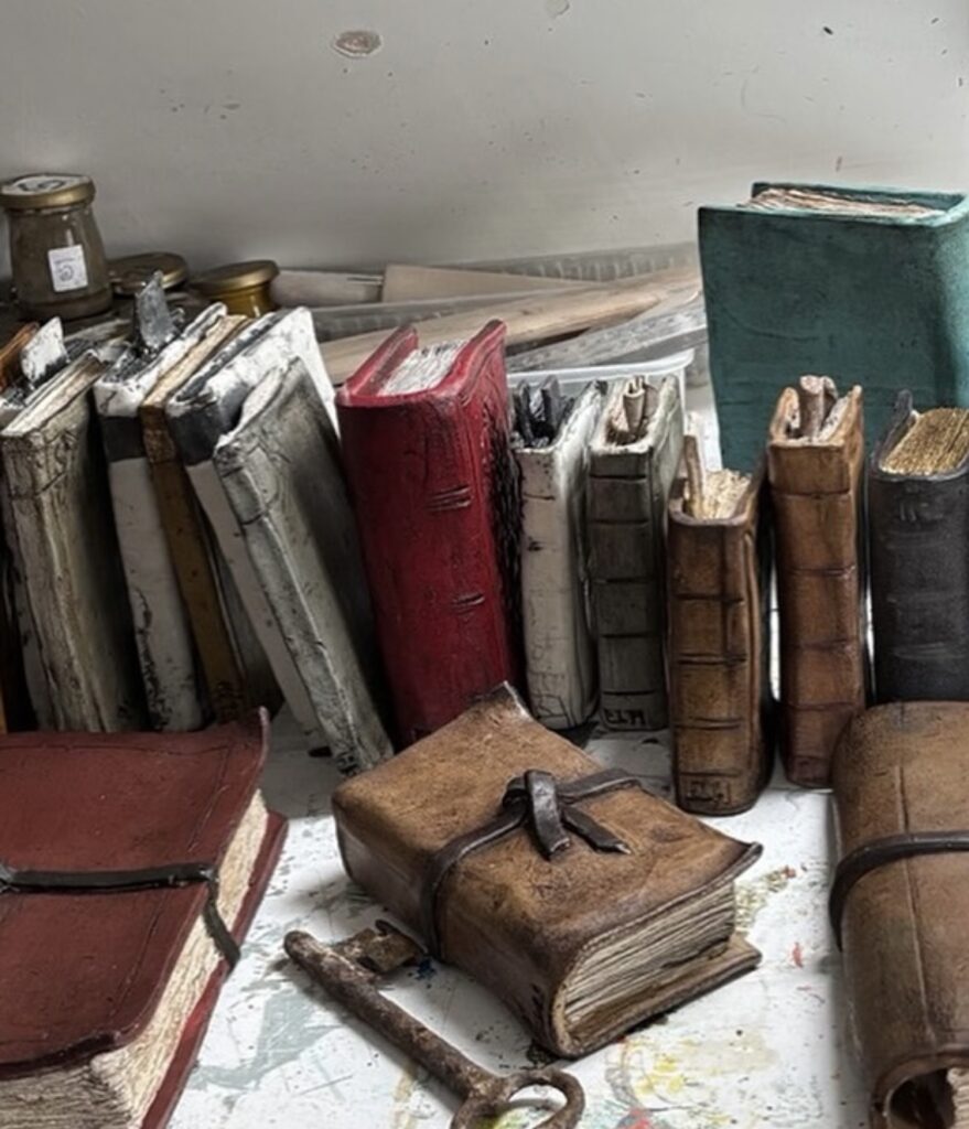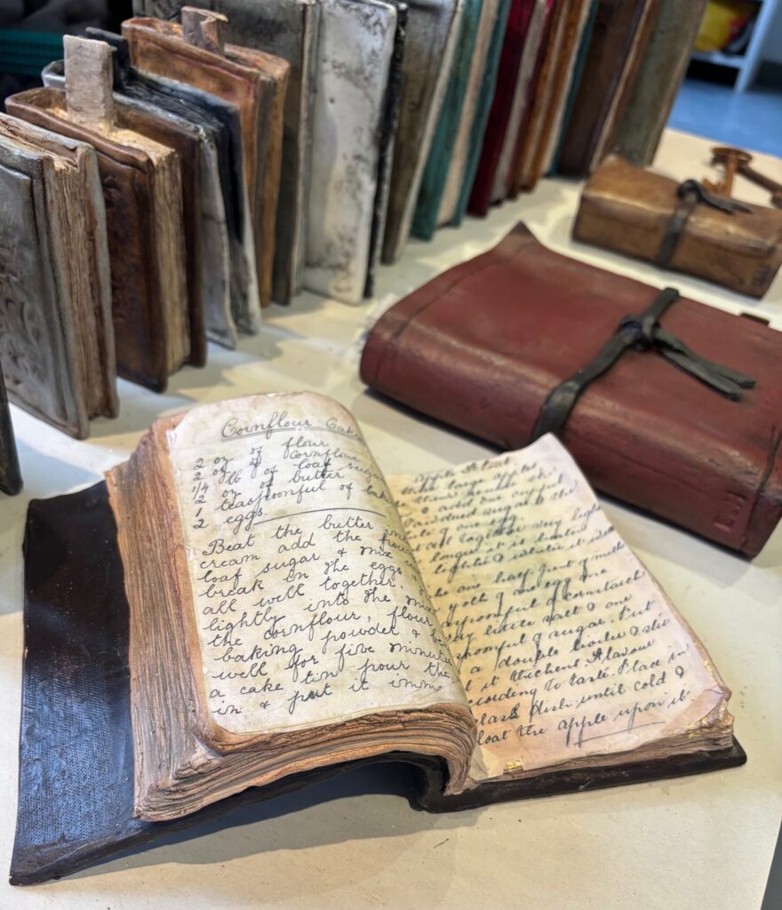 A selection of ceramics, some raku fired, and a collection of ceramic waxed books.