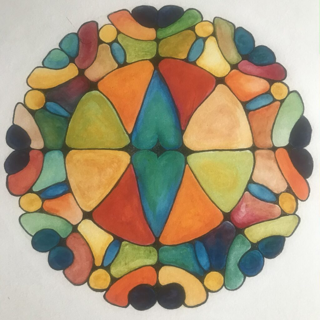 encaustic, acrylic , watercolour, ink, weaving, beading, mandalas
