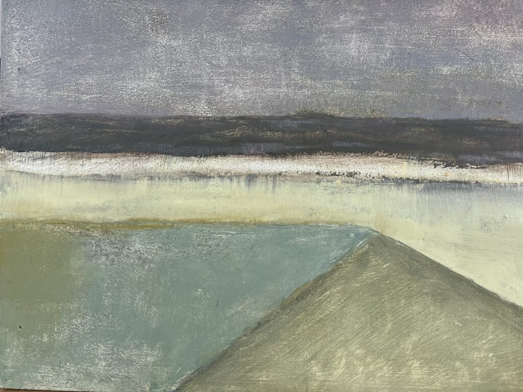Summers spent under the huge skies of Cornwall fuelled her obsession with the elements of sky and sea and a focus on life as seen through the eyes of the viewer – a view that extends beyond the picture plane towards the launching point of a distant horizon.