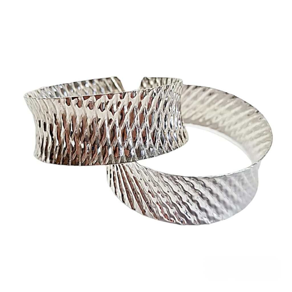 With my jewellery I like to take a piece of inert metal and twist and form it into life. I love how I can use texturing, folding and forming techniques to give a flat piece of silver a three-dimensional shape. I source recycled sterling silver sheet and wire, with occasional accents of gold, for my designs.