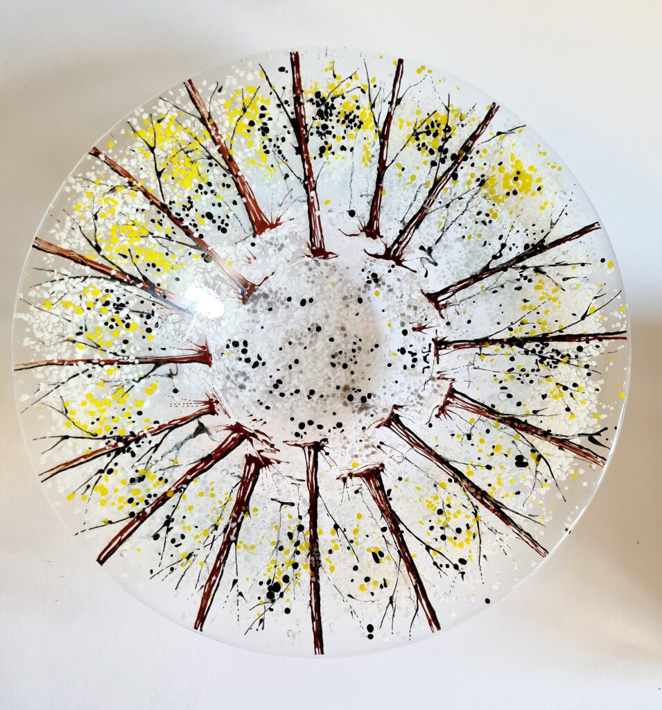 My glass is formed from small pieces of glass called frit that I use on clear glass to from pictures. I also like to use the scientific properties of the elements used to colour glass to create pattens.