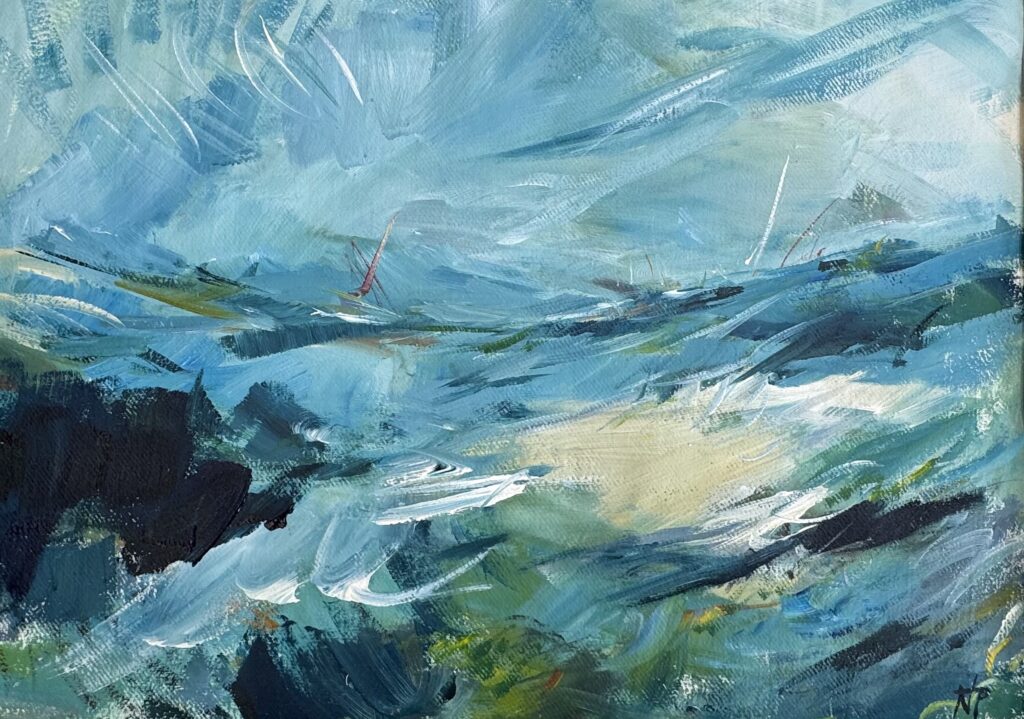 Her work consists of original artwork and screen prints of seascapes, landscapes, botanicals in a semi abstract style.