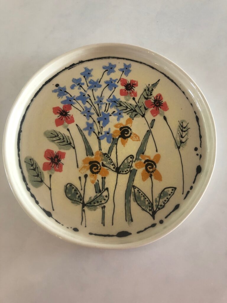 I mainly work with a stoneware clay which has a high porcelain content, it is fine, yet versatile. I throw some pieces and hand-build others, both techniques are highly satisfying. The most time-consuming part of the making process is decorating. I love to use coloured slips to draw, paint and print on the surfaces of my pieces.
